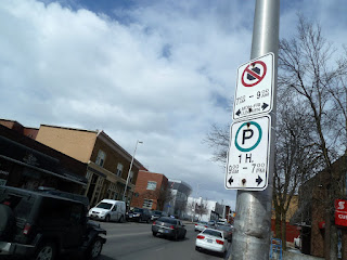 この交通量が多い通りでも、9時から19時までは1時間以内であれば無料もしくは有料で駐車できる。